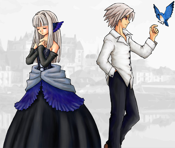 ふたり 同人誌の表紙に描いた二人です。 分離して描いているのは編集をラクにするため、なんですが。 やはり別に描いてしまうと、全体的な絵として おかしい事になってしまう事もあり、あんまり良くないんですけどね。 実は同人誌の表紙では、グウェンドリンのスカートの下から オズの靴が覗いてて、しまったなー、とか思ったんですがー。 二人並んでたら、コレ見えないはずですよねー。 しかし、グウェンドリンがなかなかうまくいかなくて 何度も描き直してました。